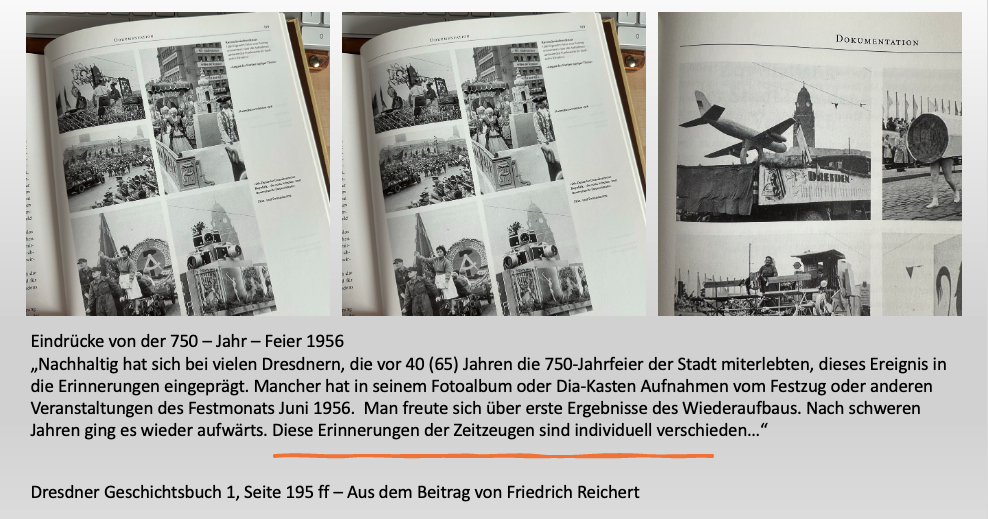 Elf Jahre nach dem Krieg diese Feier. Man liest in dieser Dokumentation, dass es 1906 gar keine Feier gegeben hat. Dafür haben aber die Wettiner 1989 ihr achtjähriges Haus gefeiert. Tja, damals gab es, wie man sieht, noch eine hoffnungsvolle Flugzeugindustrie in Dresden. Passend zum Thema 750-Jahre lesen wir auch gleich etwas über das Dresdner Stadtwappen.